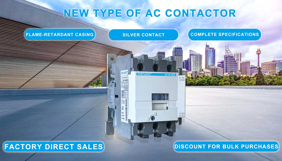 SONTUOEC е еден од кинеските добавувачи/производители специјализирани за производство на различни мали електрични апарати AC Контакторот од серијата ST1N е погоден за користење во кола номинален напон до 660V AC 50Hz или 60Hz, номинална струја до 95A, за правење и прекинување на моторот, често палење на струја. Во комбинација со помошниот контакт блок, доцнењето на тајмерот и уредот за блокирање на машината итн, тој станува контактор за одложување, механички контактор за блокирање, стартер ѕвезда-триаголник. Со термичкото реле се комбинира во електромагнетниот стартер. Контакторот е произведен според IEC 60947-1.